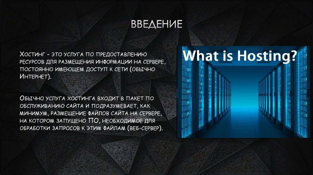 ХОСТИНГ - ЭТО УСЛУГА ПО ПРЕДОСТАВЛЕНИЮРЕСУРСОВ ДЛЯ РАЗМЕЩЕНИЯ ИНФОРМАЦИИ НА СЕРВЕРЕ,