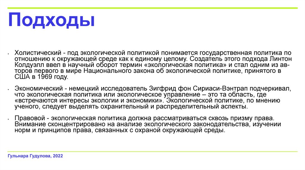 ПодходыХолистический - под экологической политикой понимается государственная политика по