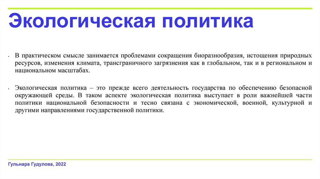 Экологическая политикаВ практическом смысле занимается проблемами сокращения биоразнообразия, истощения природных