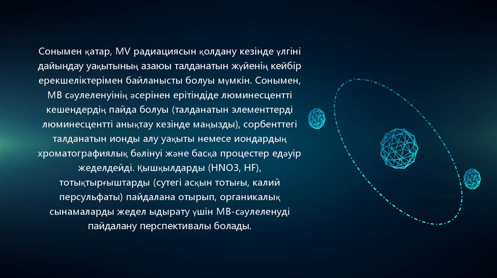 кезінде уақыт шығындарын он-жиырма есе азайтуға мүмкіндік береді. МВсәулеленуді пайдалану сынаманы ерітіндіге ауыстыру уақытының да,
