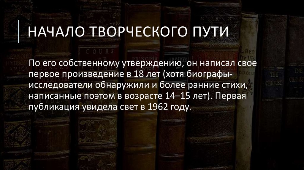 первое произведение в 18 лет (хотя биографыисследователи обнаружили и более ранние стихи,
