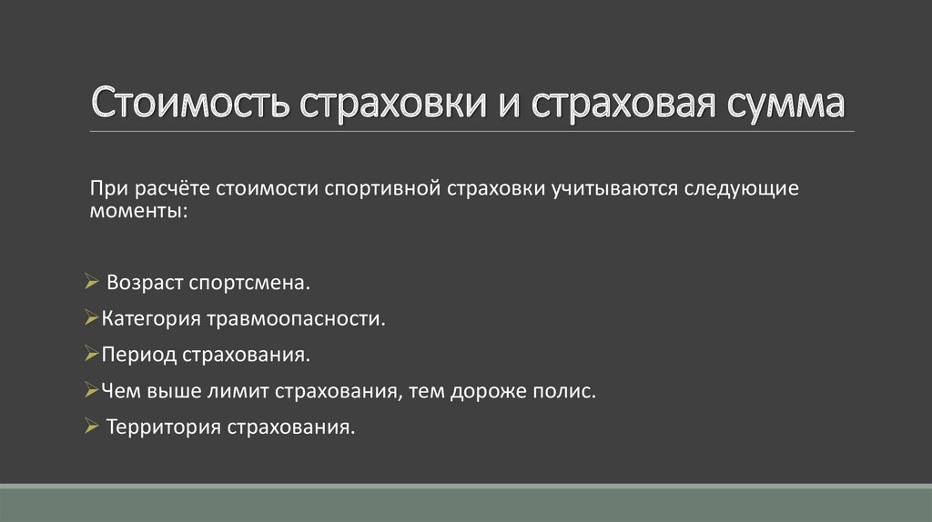 Стоимость страховки и страховая суммаПри расчёте стоимости спортивной страховки учитываются следующие