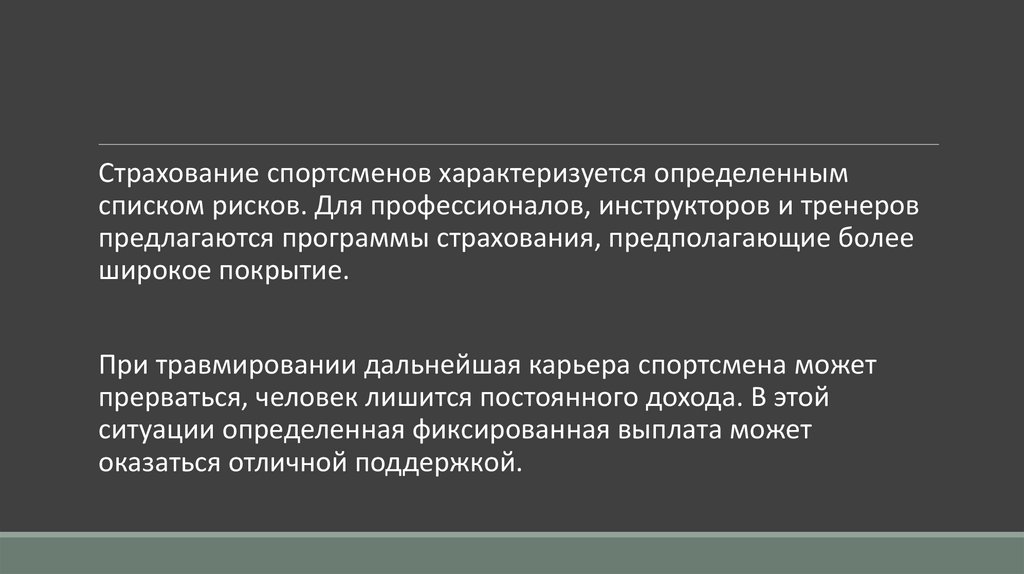 Страхование спортсменов характеризуется определеннымсписком рисков. Для профессионалов, инструкторов и тренеров