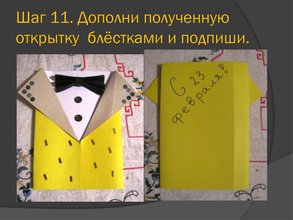 Шаг 11. Дополни полученнуюоткрытку блёстками и подпиши.