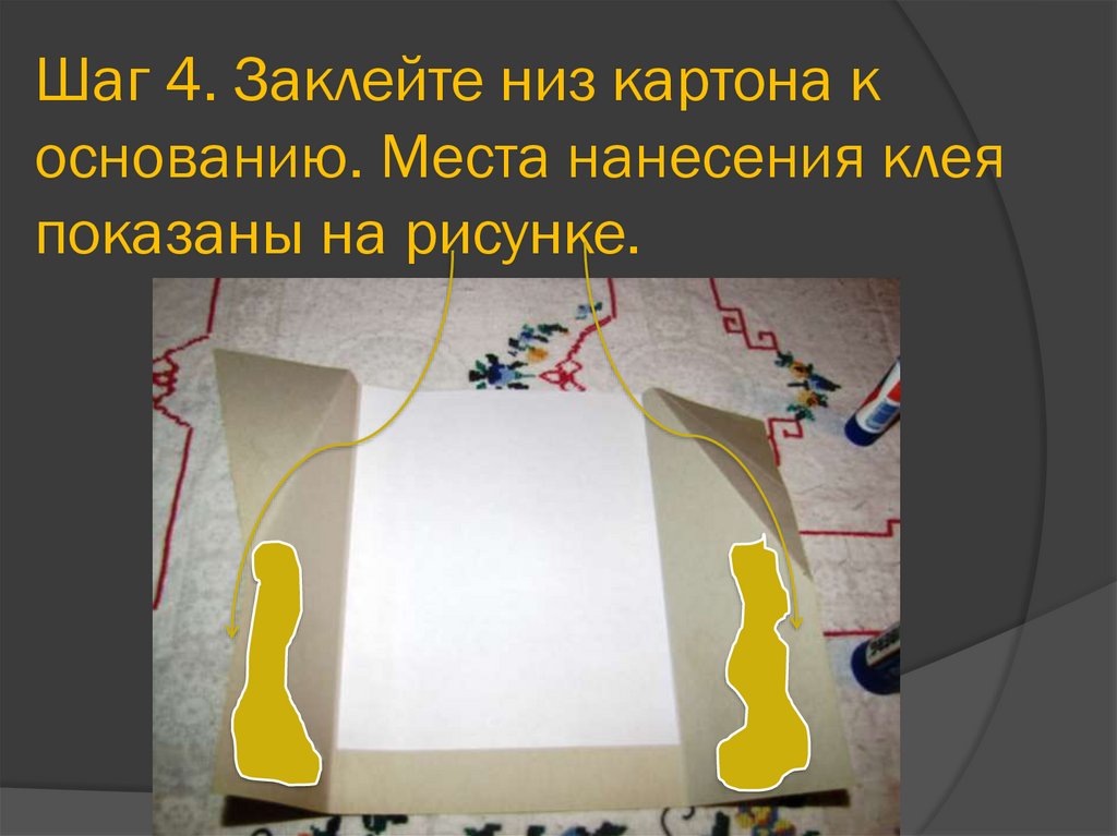 Шаг 4. Заклейте низ картона коснованию. Места нанесения клея