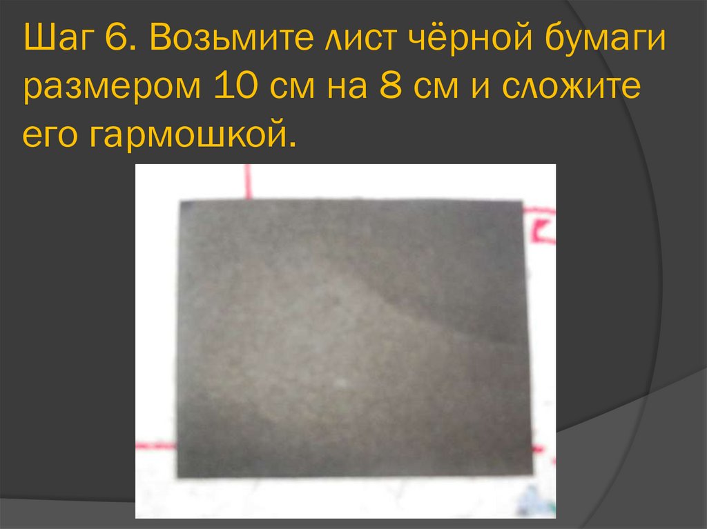 Шаг 6. Возьмите лист чёрной бумагиразмером 10 см на 8 см и сложите