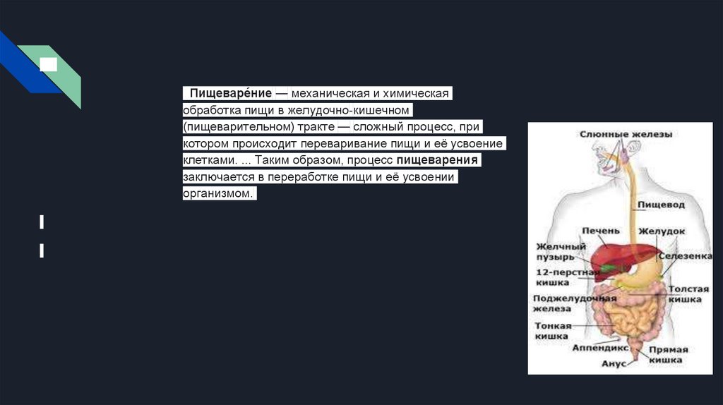Пищеваре́ние — механическая и химическаяобработка пищи в желудочно-кишечном