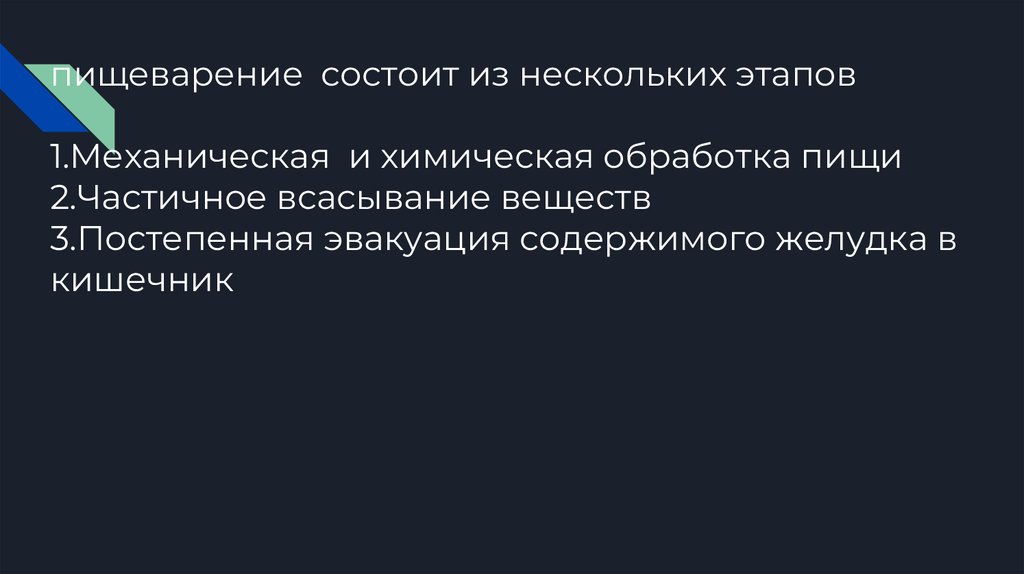 пищеварение состоит из нескольких этапов1.Механическая и химическая обработка пищи