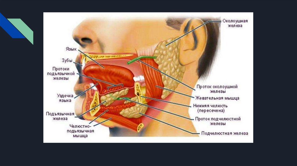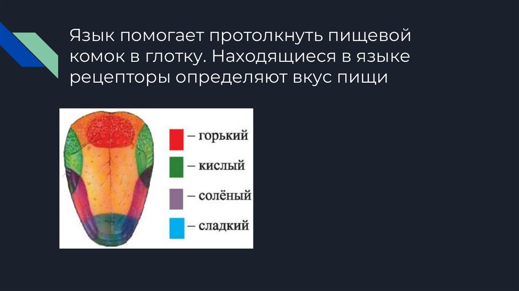 Язык помогает протолкнуть пищевойкомок в глотку. Находящиеся в языке
