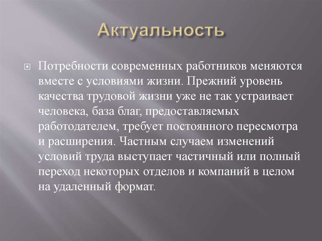 Потребности современных работников меняютсявместе с условиями жизни. Прежний уровень