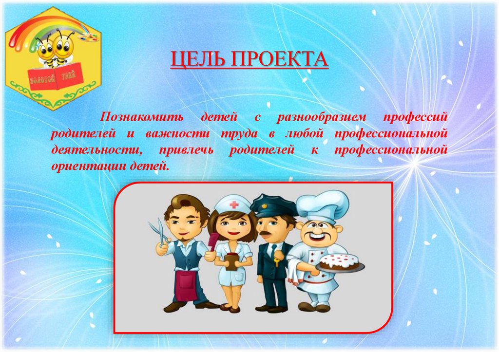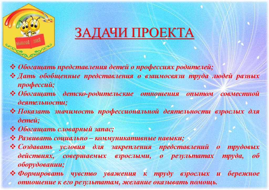 ЗАДАЧИ ПРОЕКТАОбогащать представления детей о профессиях родителей;