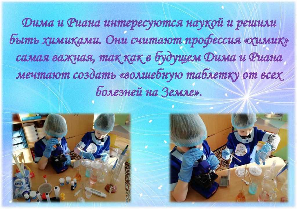 Дима и Риана интересуются наукой и решилибыть химиками. Они считают профессия «химик»