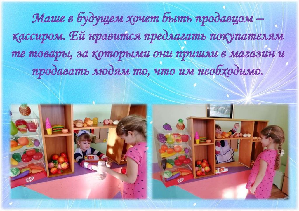 Маше в будущем хочет быть продавцом –кассиром. Ей нравится предлагать покупателям