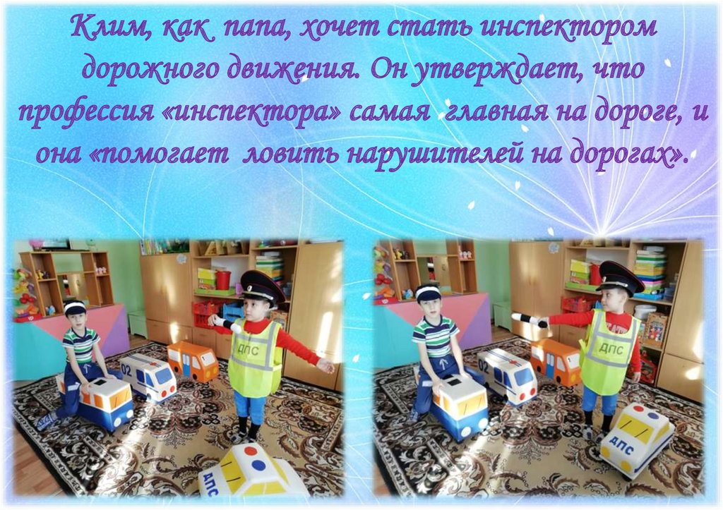 Клим, как папа, хочет стать инспекторомдорожного движения. Он утверждает, что