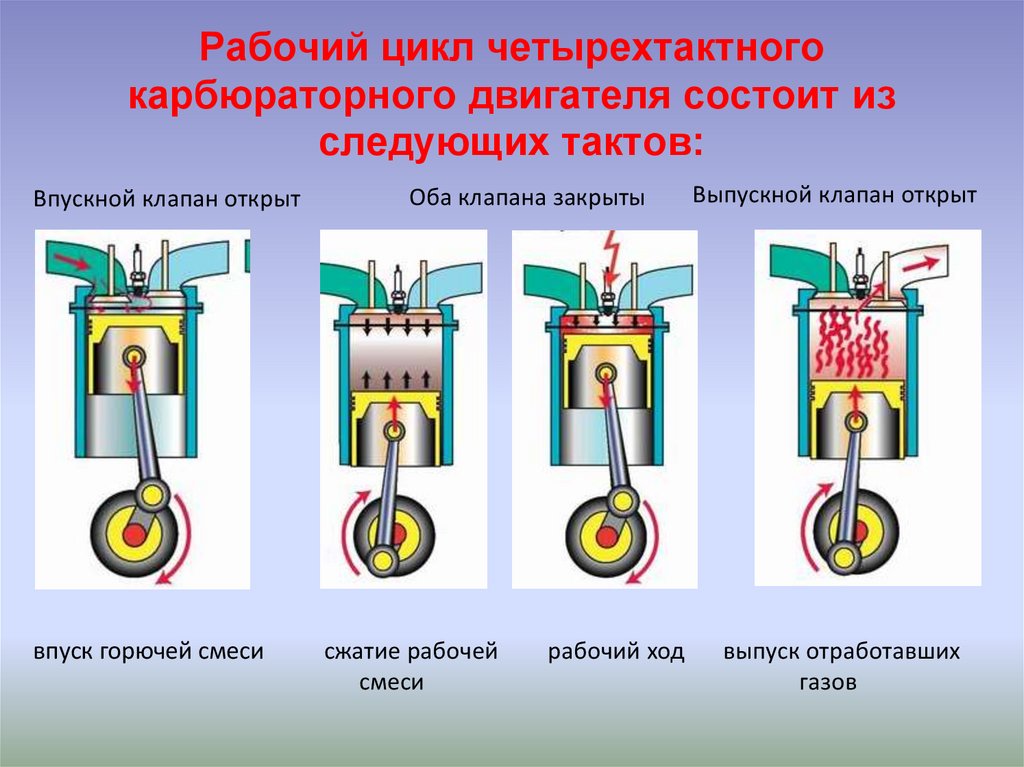 Рабочий цикл четырехтактногокарбюраторного двигателя состоит из