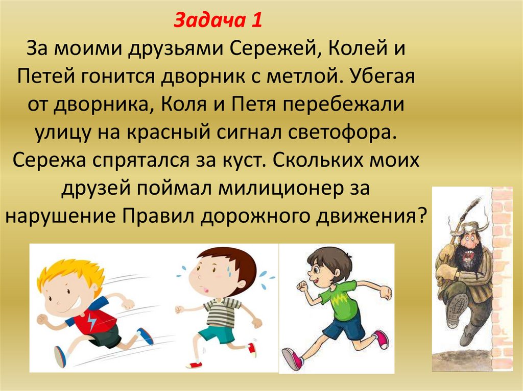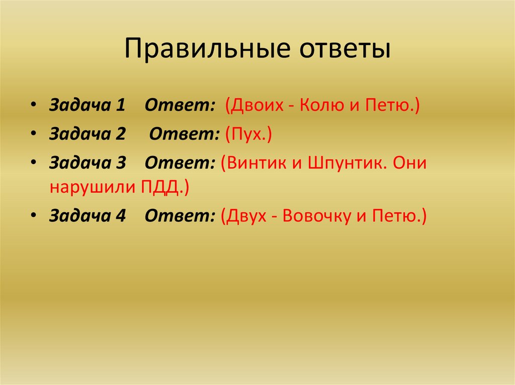 Правильные ответы• Задача 1 Ответ: (Двоих - Колю и Петю.)