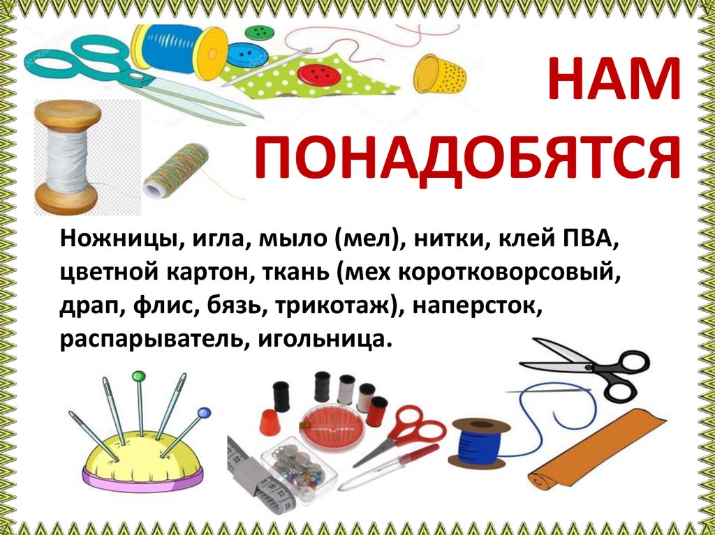 Ножницы, игла, мыло (мел), нитки, клей ПВА,
