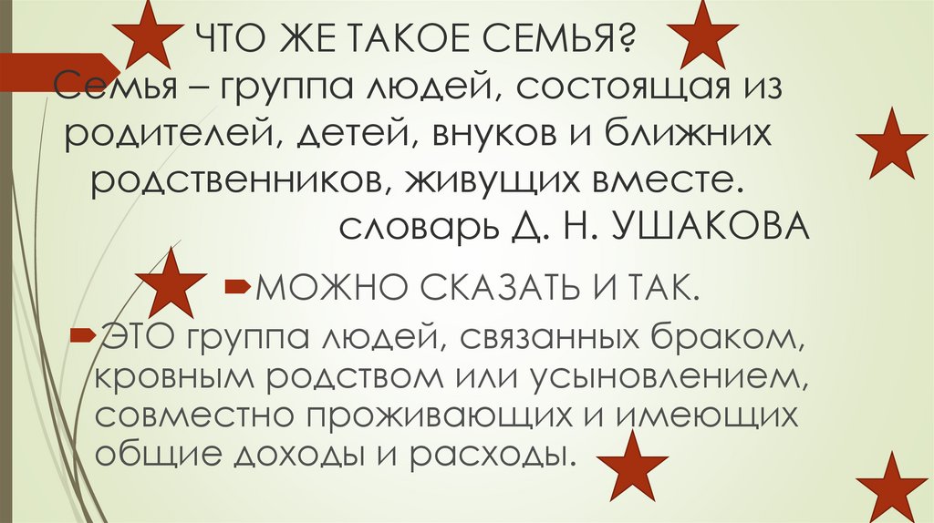 ЧТО ЖЕ ТАКОЕ СЕМЬЯ?Семья – группа людей, состоящая из