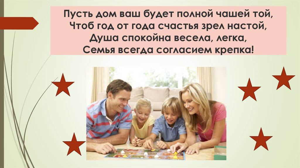 Пусть дом ваш будет полной чашей той,Чтоб год от года счастья зрел настой,