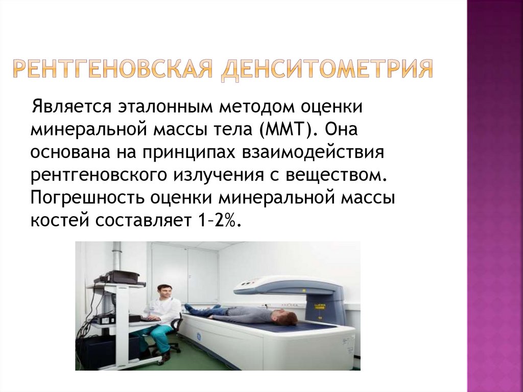 Является эталонным методом оценкиминеральной массы тела (ММТ). Она