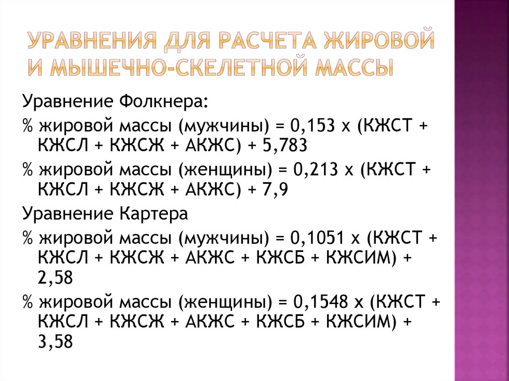 Уравнение Фолкнера:% жировой массы (мужчины) = 0,153 х (КЖСТ +