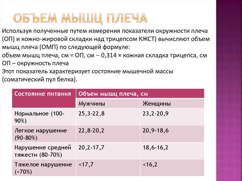 объем мышц плеча, см = ОП, см 0,314 × кожная складка трицепса, см