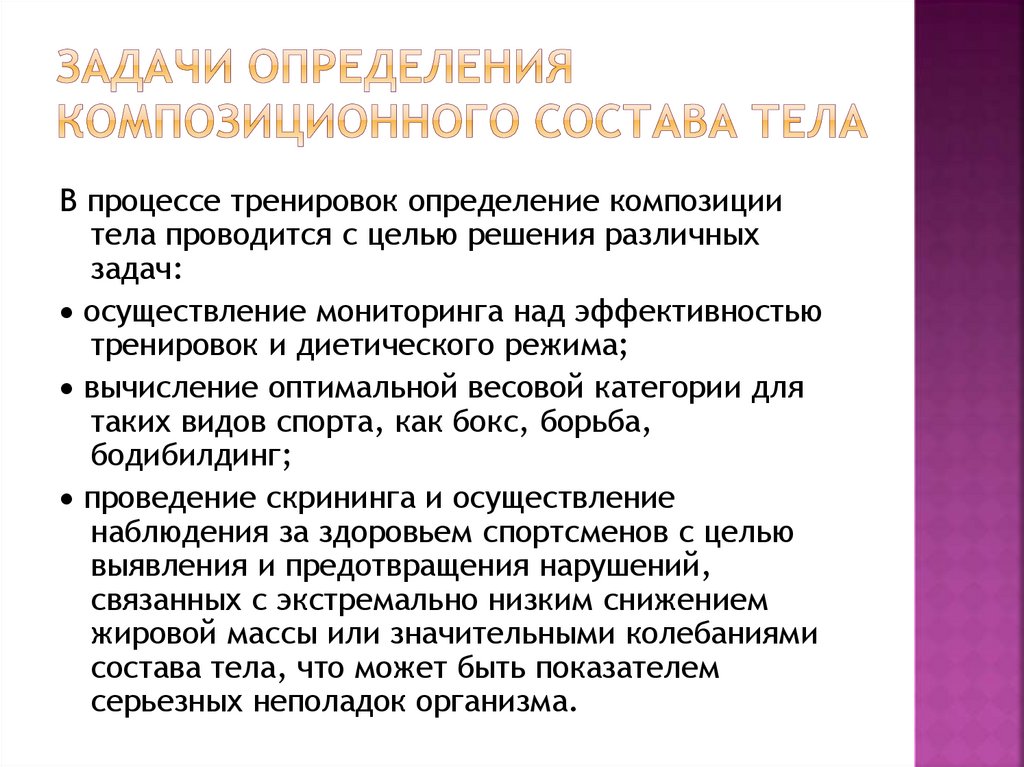 В процессе тренировок определение композициитела проводится с целью решения различных