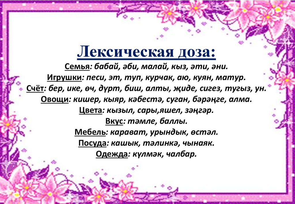Лексическая доза:Семья: бабай, әби, малай, кыз, әти, әни.