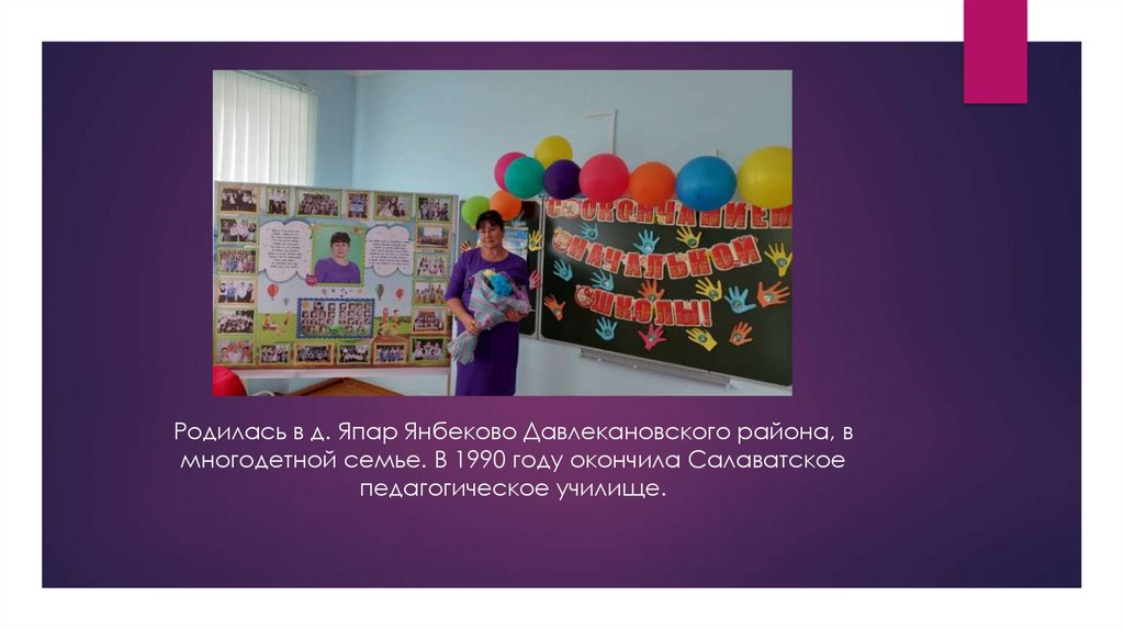 Родилась в д. Япар Янбеково Давлекановского района, вмногодетной семье. В 1990 году окончила Салаватское