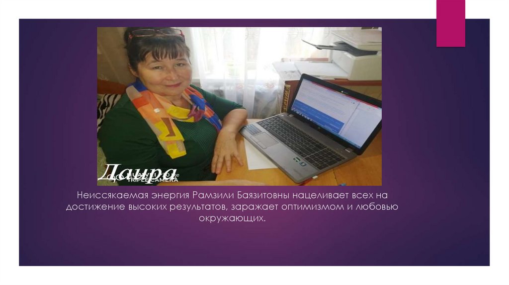 Неиссякаемая энергия Рамзили Баязитовны нацеливает всех надостижение высоких результатов, заражает оптимизмом и любовью