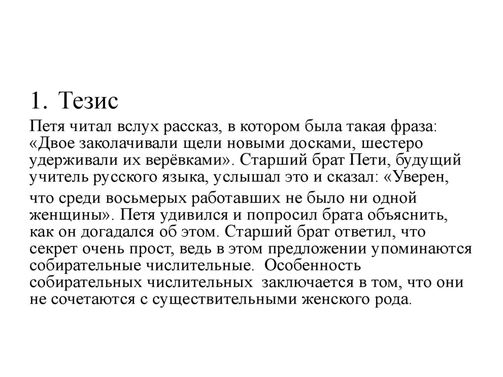 1. ТезисПетя читал вслух рассказ, в котором была такая фраза: