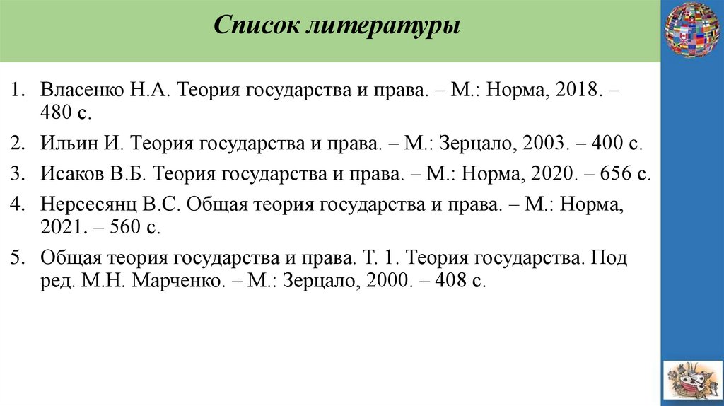 Список литературы1. Власенко Н.А. Теория государства и права. – М.: Норма, 2018. –