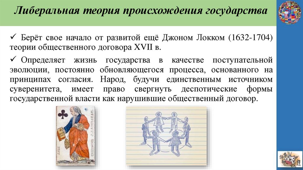 Либеральная теория происхождения государстваБерёт свое начало от развитой ещё Джоном Локком (1632-1704)