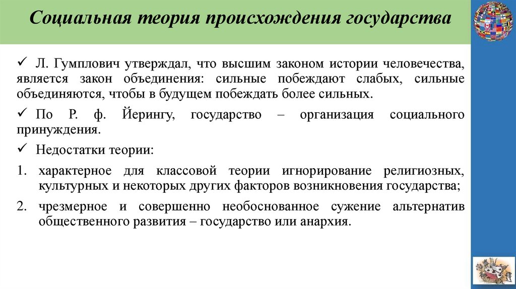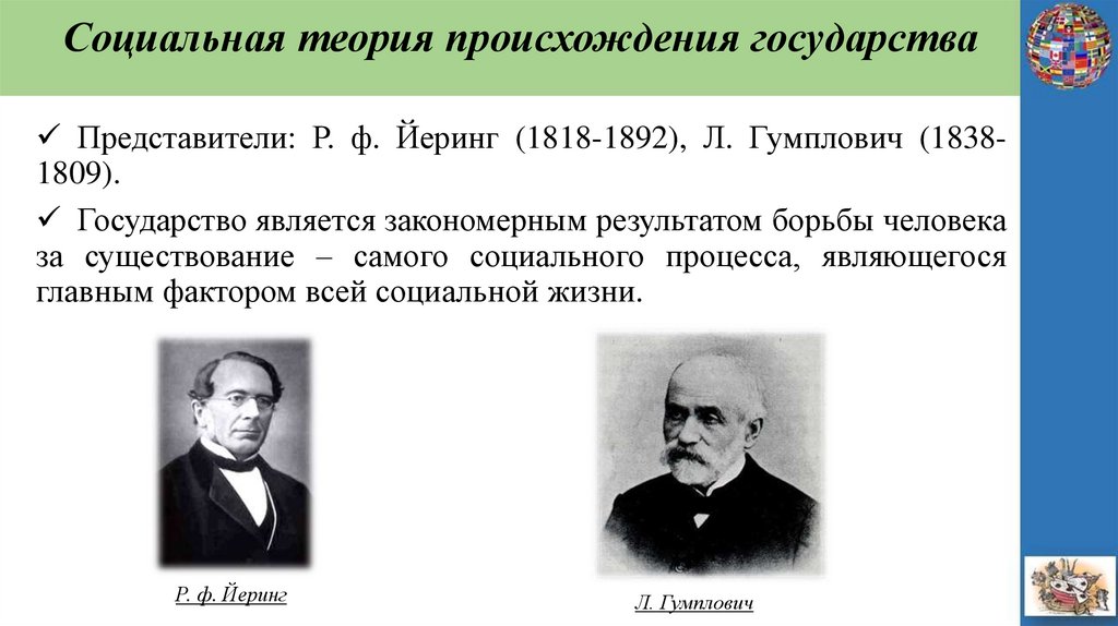 Социальная теория происхождения государстваПредставители: Р. ф. Йеринг (1818-1892), Л. Гумплович (18381809).