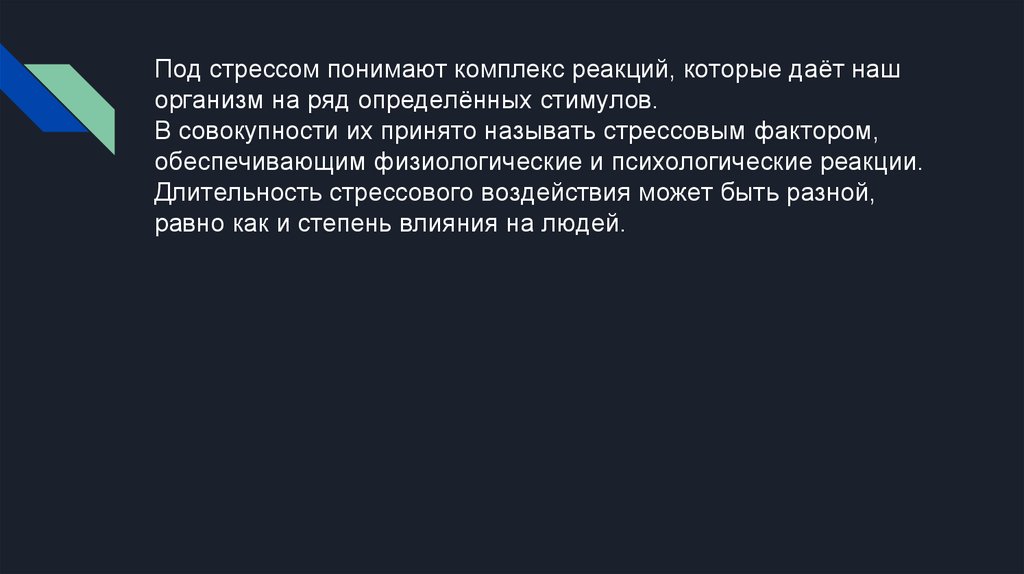Под стрессом понимают комплекс реакций, которые даёт нашорганизм на ряд определённых стимулов.