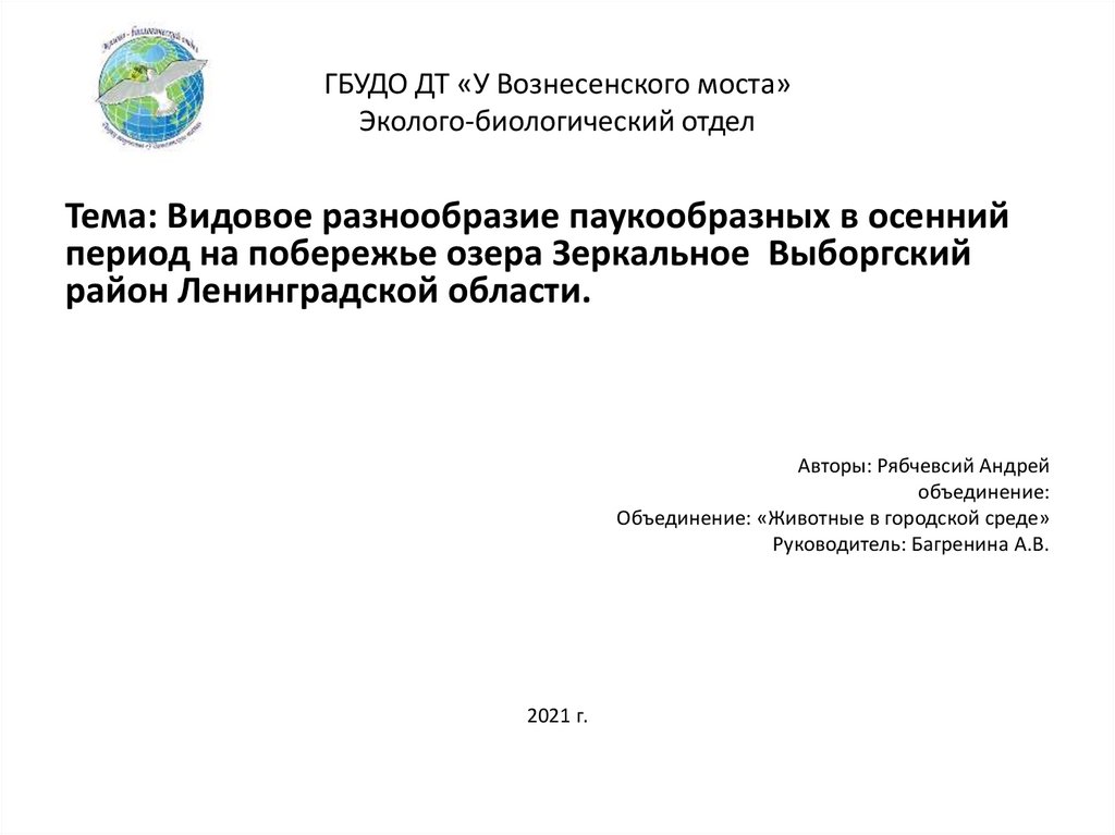 Видовое разнообразие паукообразных в осенний период на побережье озера Зеркальное Выборгский район Ленинградской области