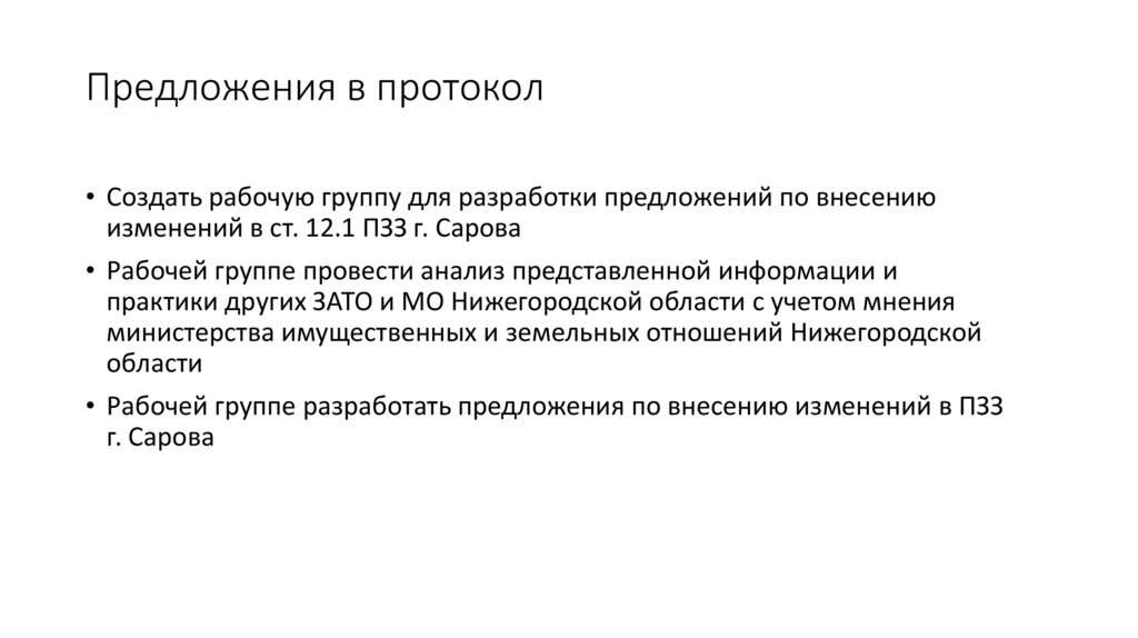 • Рабочей группе разработать предложения по внесению изменений в ПЗЗ
