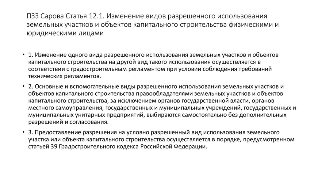 ПЗЗ Сарова Статья 12.1. Изменение видов разрешенного использованияземельных участков и объектов капитального строительства физическими и