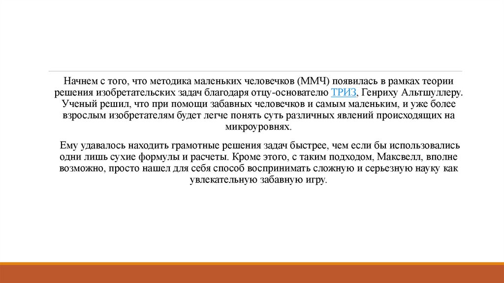 Начнем с того, что методика маленьких человечков (ММЧ) появилась в рамках теориирешения изобретательских задач благодаря отцу-основателю ТРИЗ, Генриху Альтшуллеру.