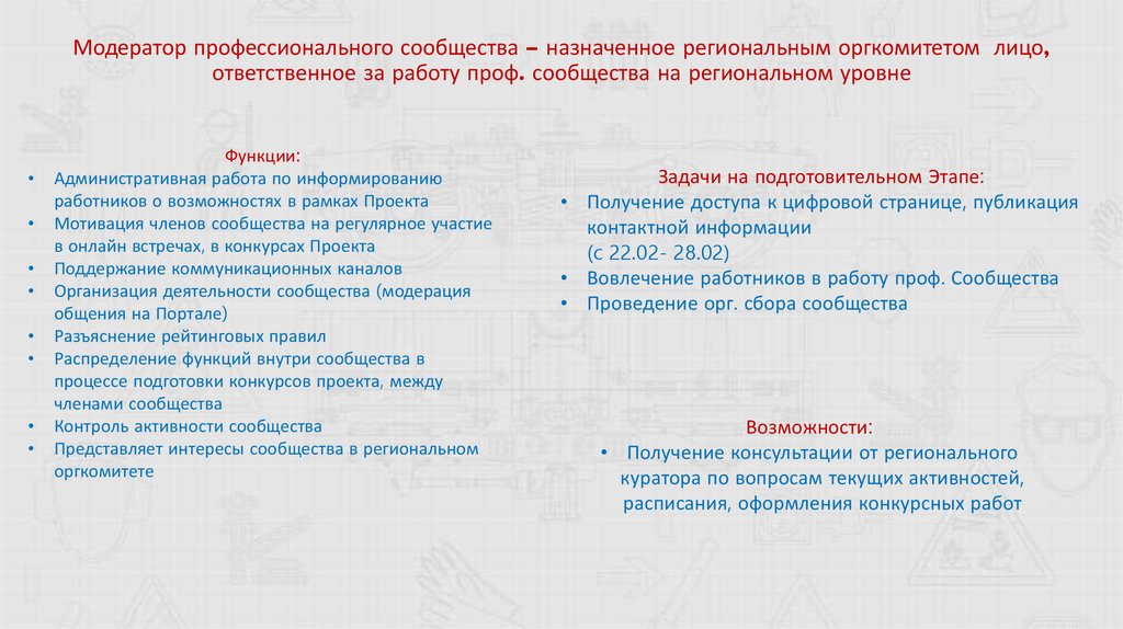 Модератор профессионального сообщества – назначенное региональным оргкомитетом лицо,ответственное за работу проф. сообщества на региональном уровне