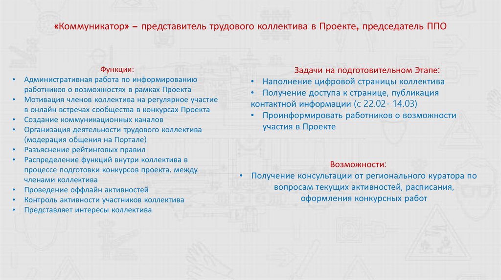 «Коммуникатор» – представитель трудового коллектива в Проекте, председатель ППОФункции: