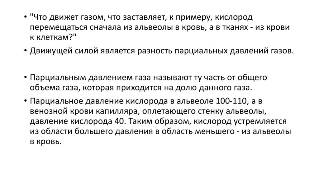 • "Что движет газом, что заставляет, к примеру, кислородперемещаться сначала из альвеолы в кровь, а в тканях - из крови
