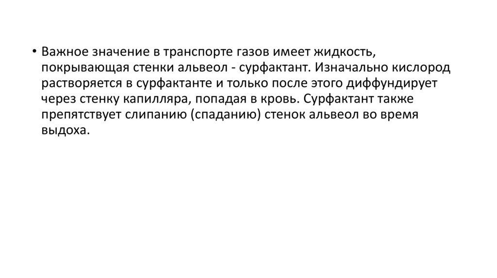 • Важное значение в транспорте газов имеет жидкость,покрывающая стенки альвеол - сурфактант. Изначально кислород