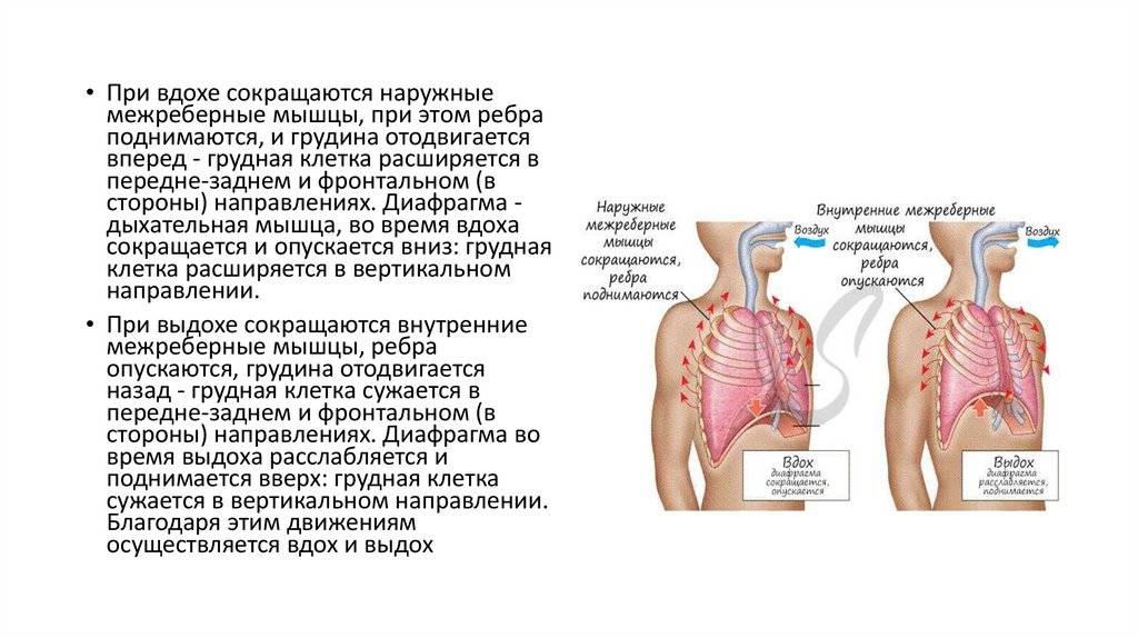 • При вдохе сокращаются наружныемежреберные мышцы, при этом ребра