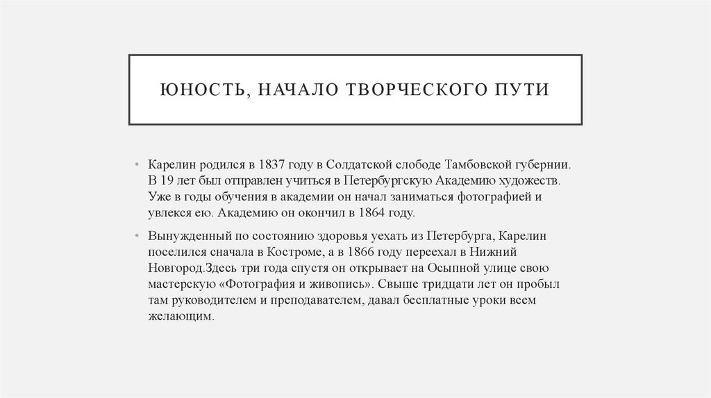 ЮНОСТЬ, НАЧАЛО ТВОРЧЕСКОГО ПУТИ• Карелин родился в 1837 году в Солдатской слободе Тамбовской губернии.