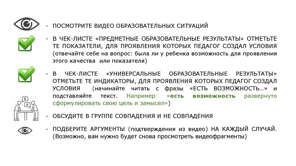 - ПОСМОТРИТЕ ВИДЕО ОБРАЗОВАТЕЛЬНЫХ СИТУАЦИЙ- В ЧЕК-ЛИСТЕ «ПРЕДМЕТНЫЕ ОБРАЗОВАТЕЛЬНЫЕ РЕЗУЛЬТАТЫ» ОТМЕТЬТЕ