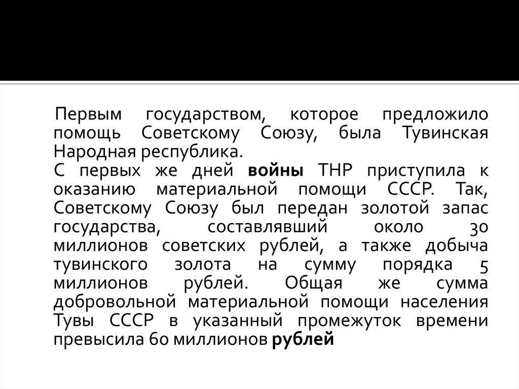 Первым государством, которое предложилопомощь Советскому Союзу, была Тувинская