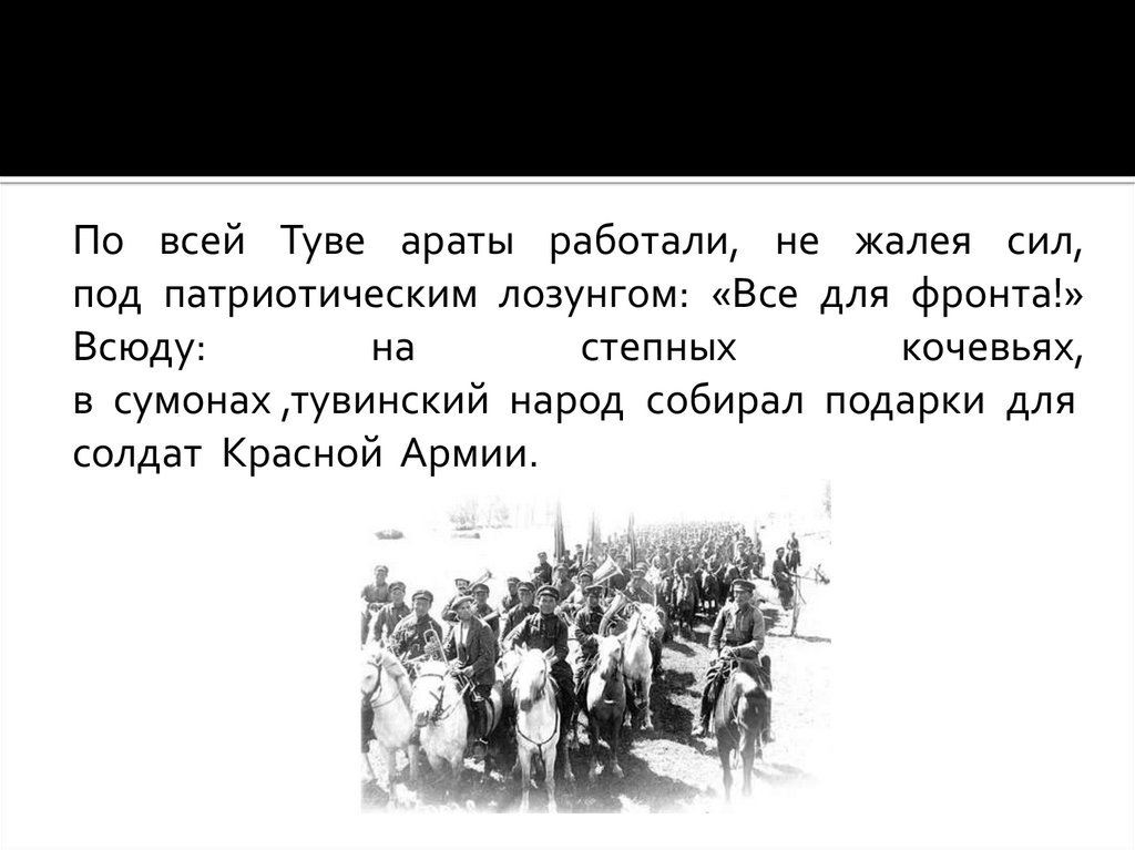 По всей Туве араты работали, не жалея сил,под патриотическим лозунгом: «Все для фронта!»