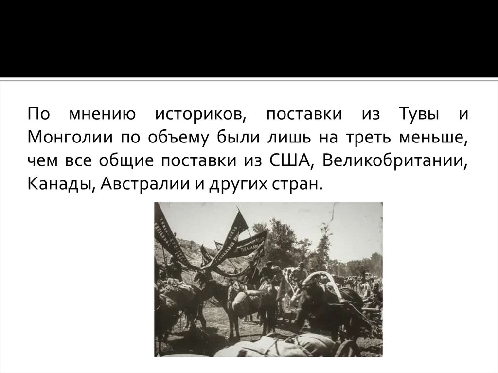 По мнению историков, поставки из Тувы иМонголии по объему были лишь на треть меньше,