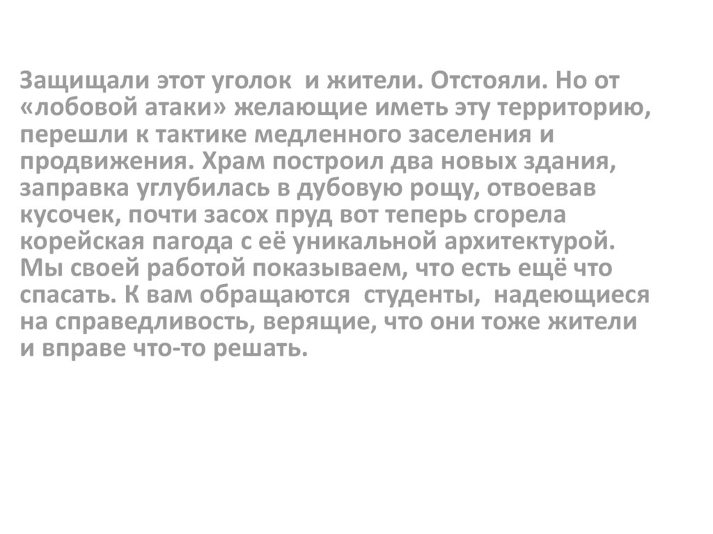 Защищали этот уголок и жители. Отстояли. Но от«лобовой атаки» желающие иметь эту территорию,